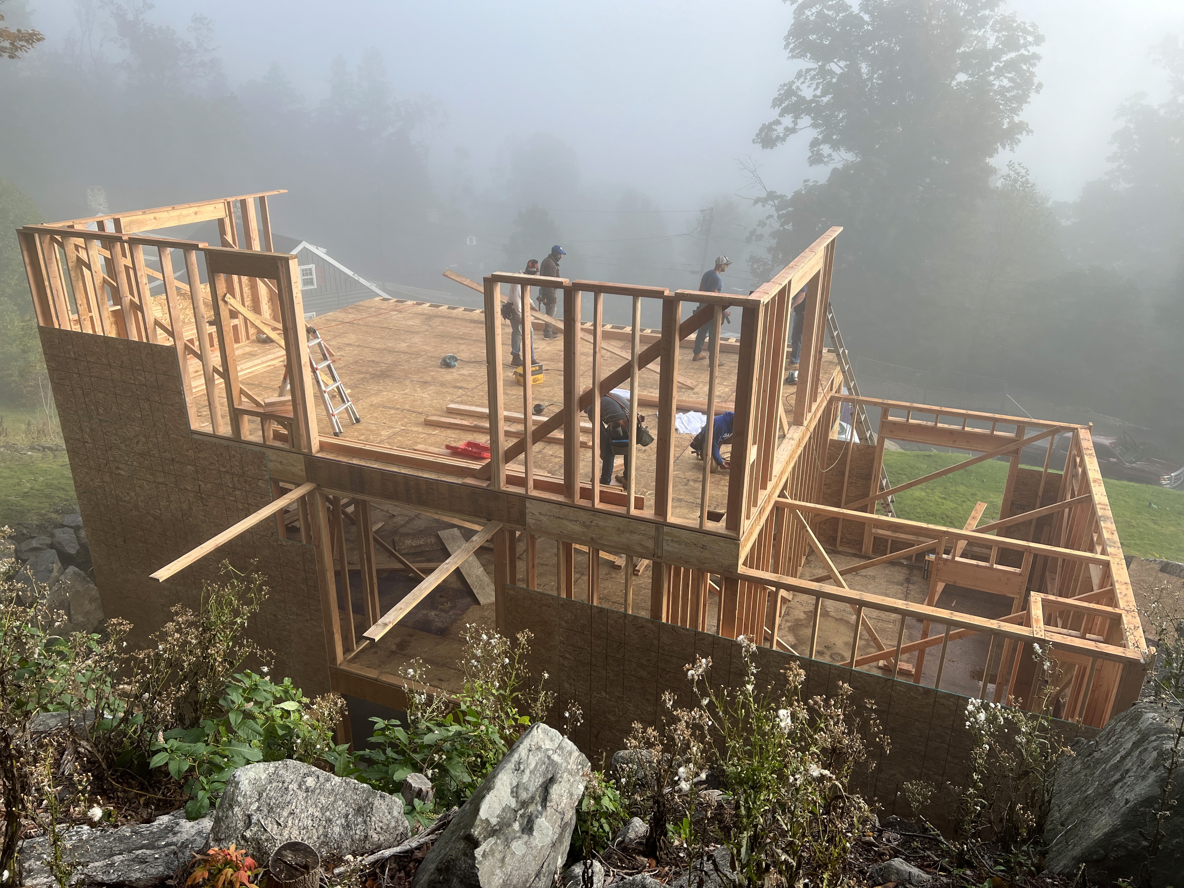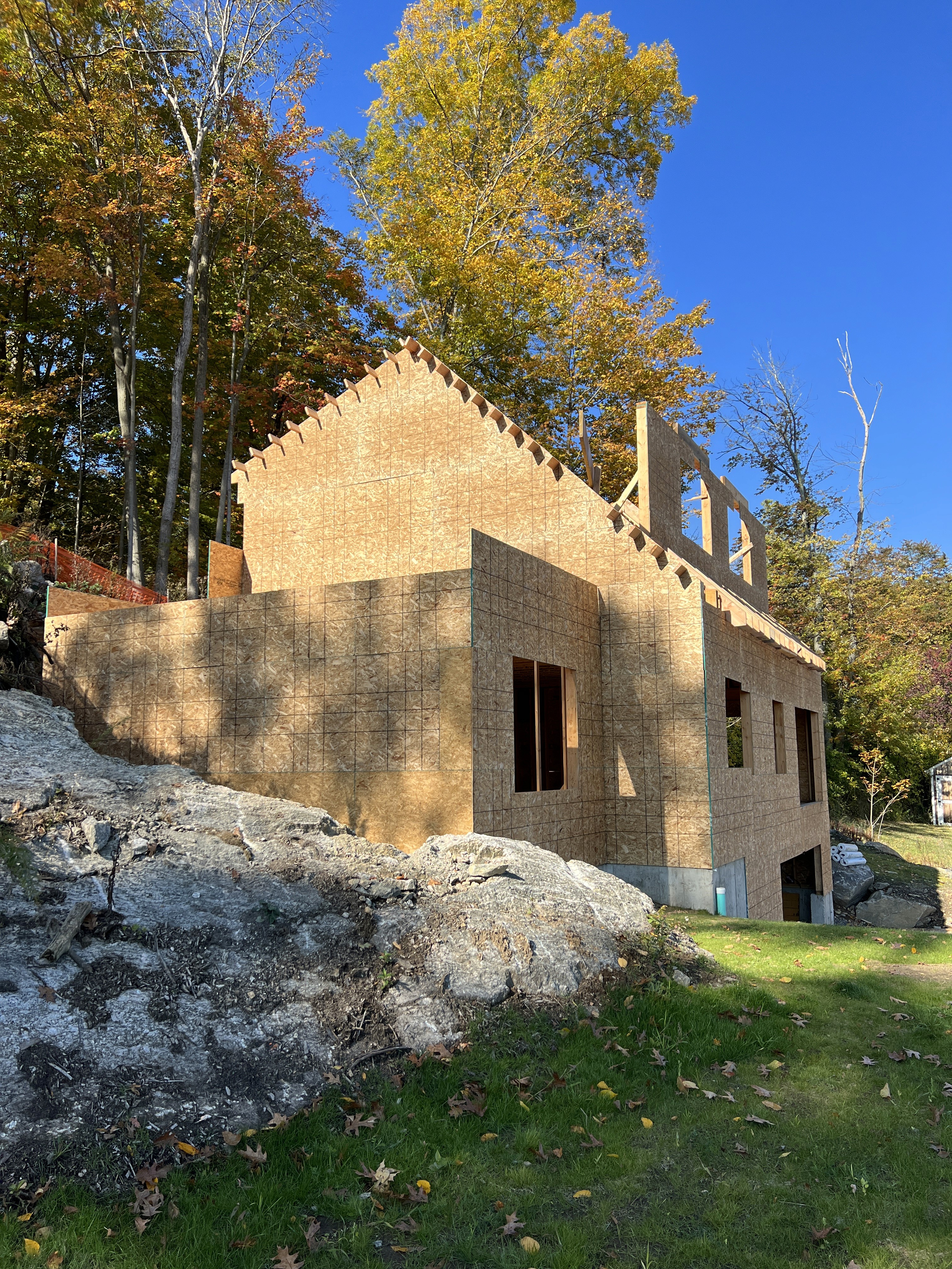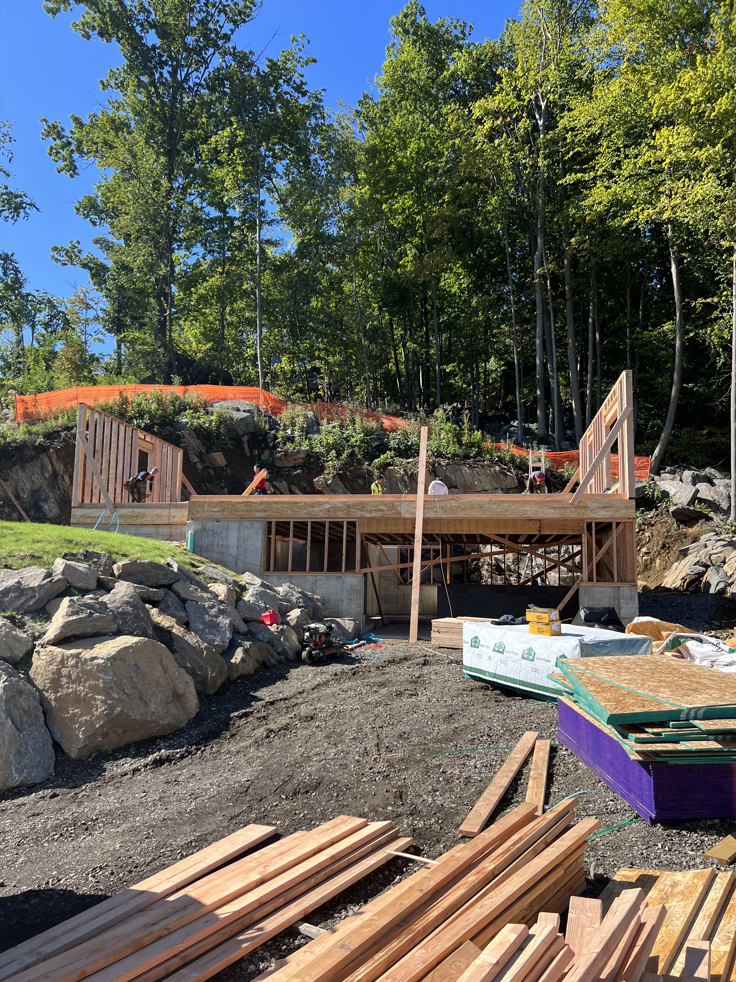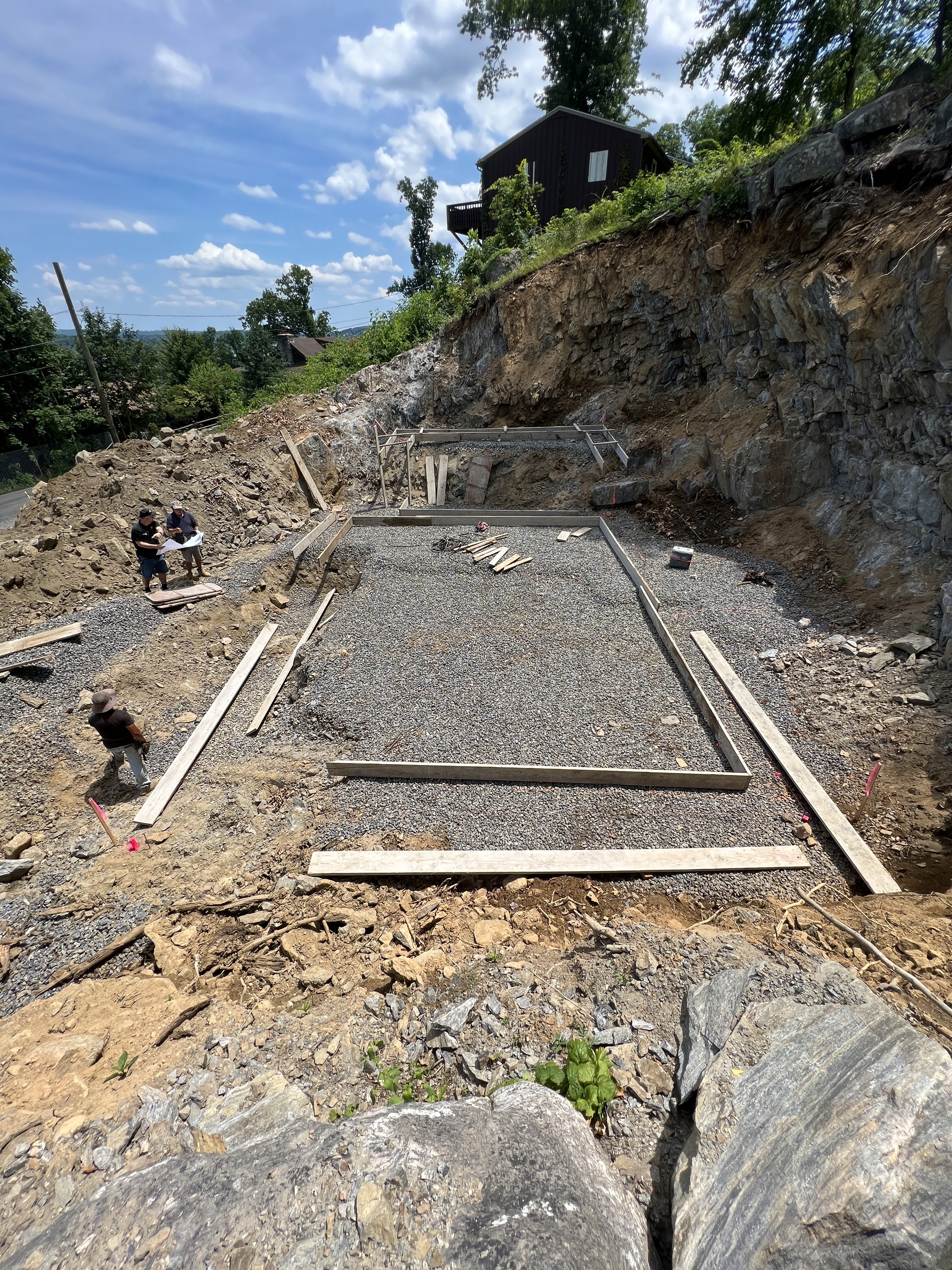 From the outset, the site presented significant challenges. The small footprint and extensive ledge required mechanical rock hammering to properly seat the foundation and create usable building platforms. Excavation was carefully sequenced to protect neighboring properties while achieving the elevations necessary for both structural integrity and lake views. Every inch of the lot was thoughtfully utilized, transforming what initially seemed like a limitation into an opportunity for a dramatic, elevated design.