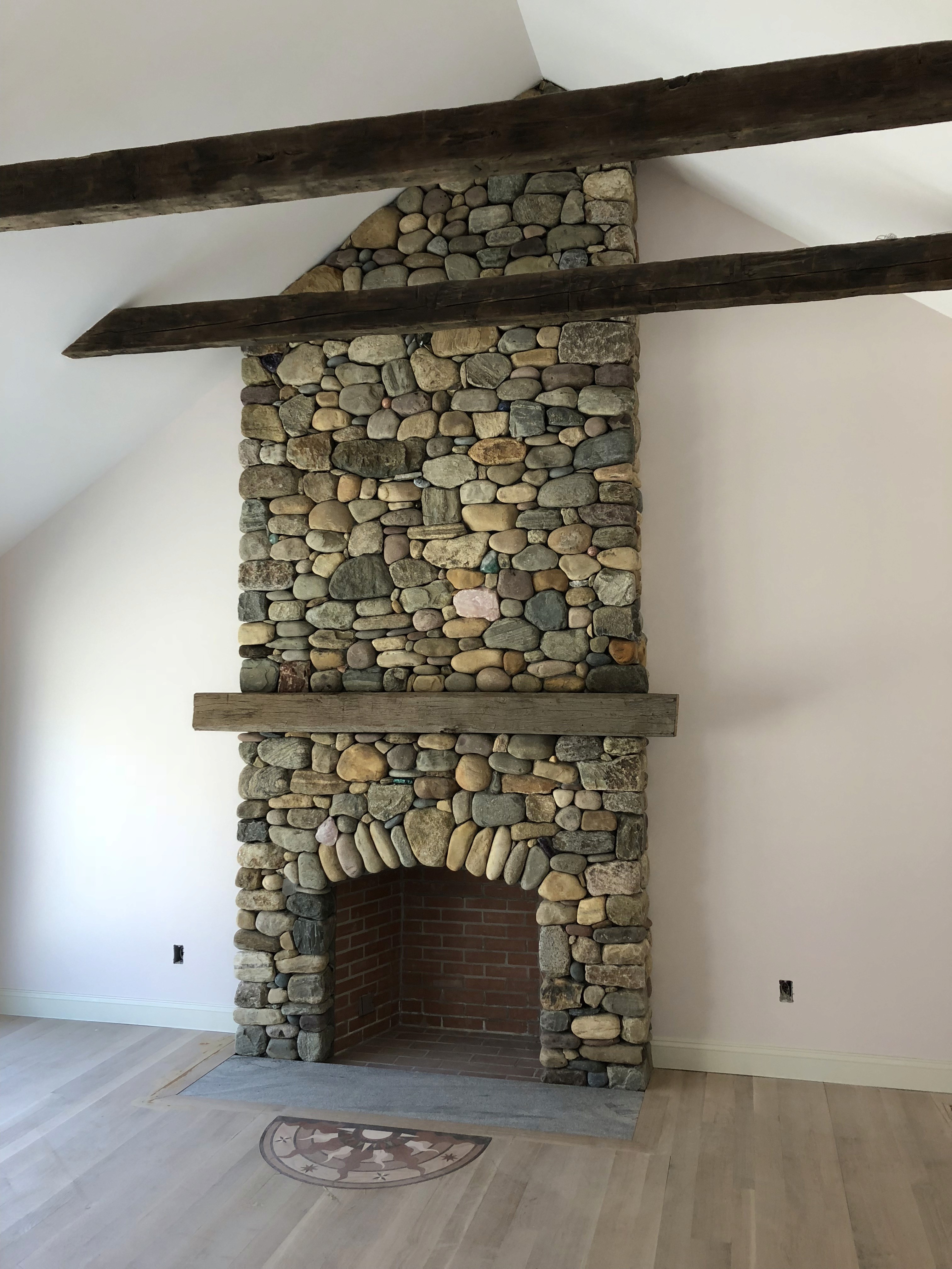 A truly stunning feature of the addition is the stone fireplace—built with hand-picked natural river rock and accented with rustic timber beams that anchor the vaulted ceiling. This space creates a warm, lodge-inspired focal point for the home while maintaining the elegance and comfort expected in a modern Connecticut residence.