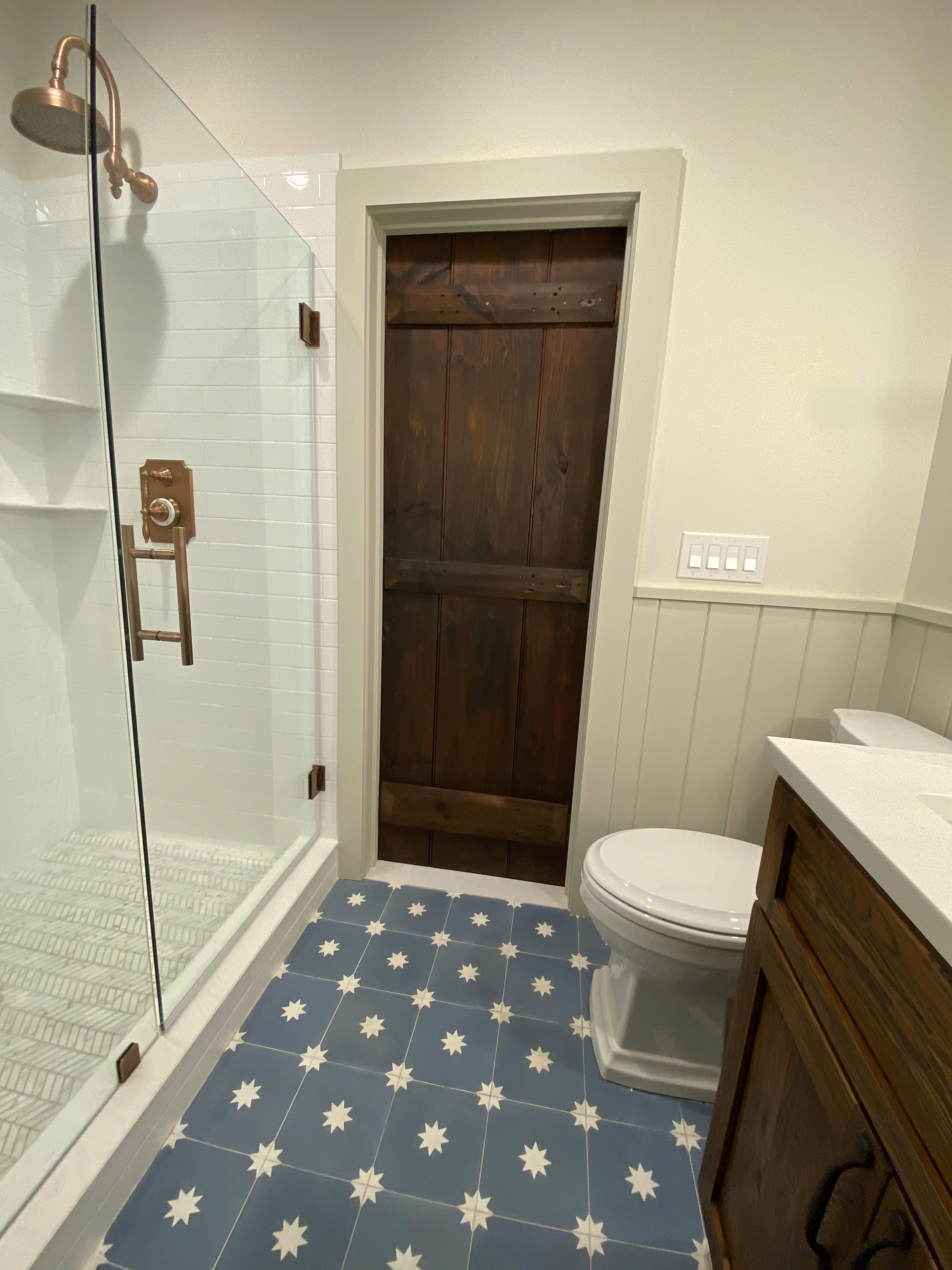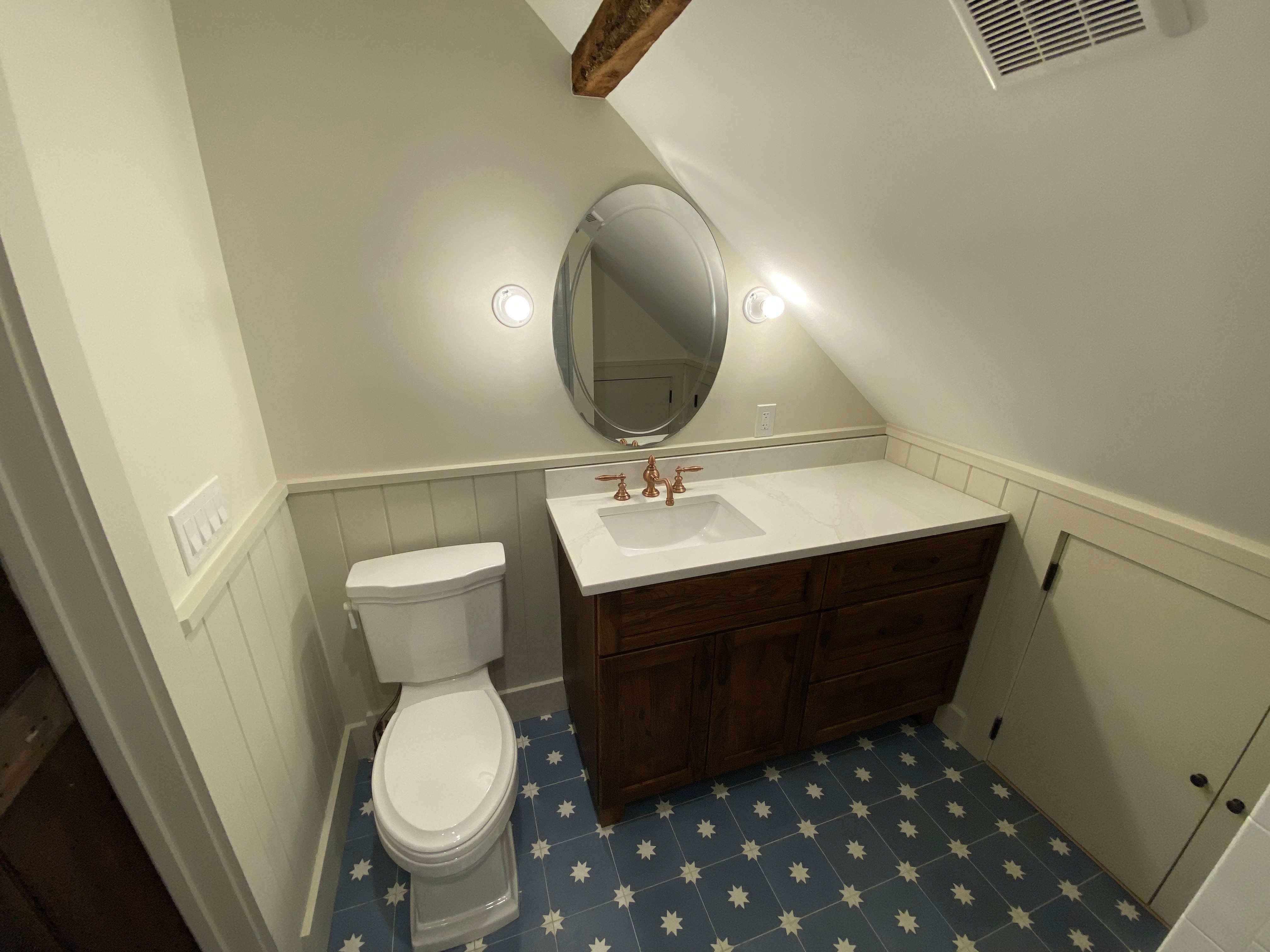 The full bathroom continues the balance of old-world craftsmanship and modern design. Beadboard wainscoting, a custom vanity, and hand-selected flooring are paired with exquisite high-end copper fixtures, giving the space a luxurious yet cottage-authentic feel. Thoughtful placement of built-ins and access doors ensures that every inch of the sloped attic remains functional.