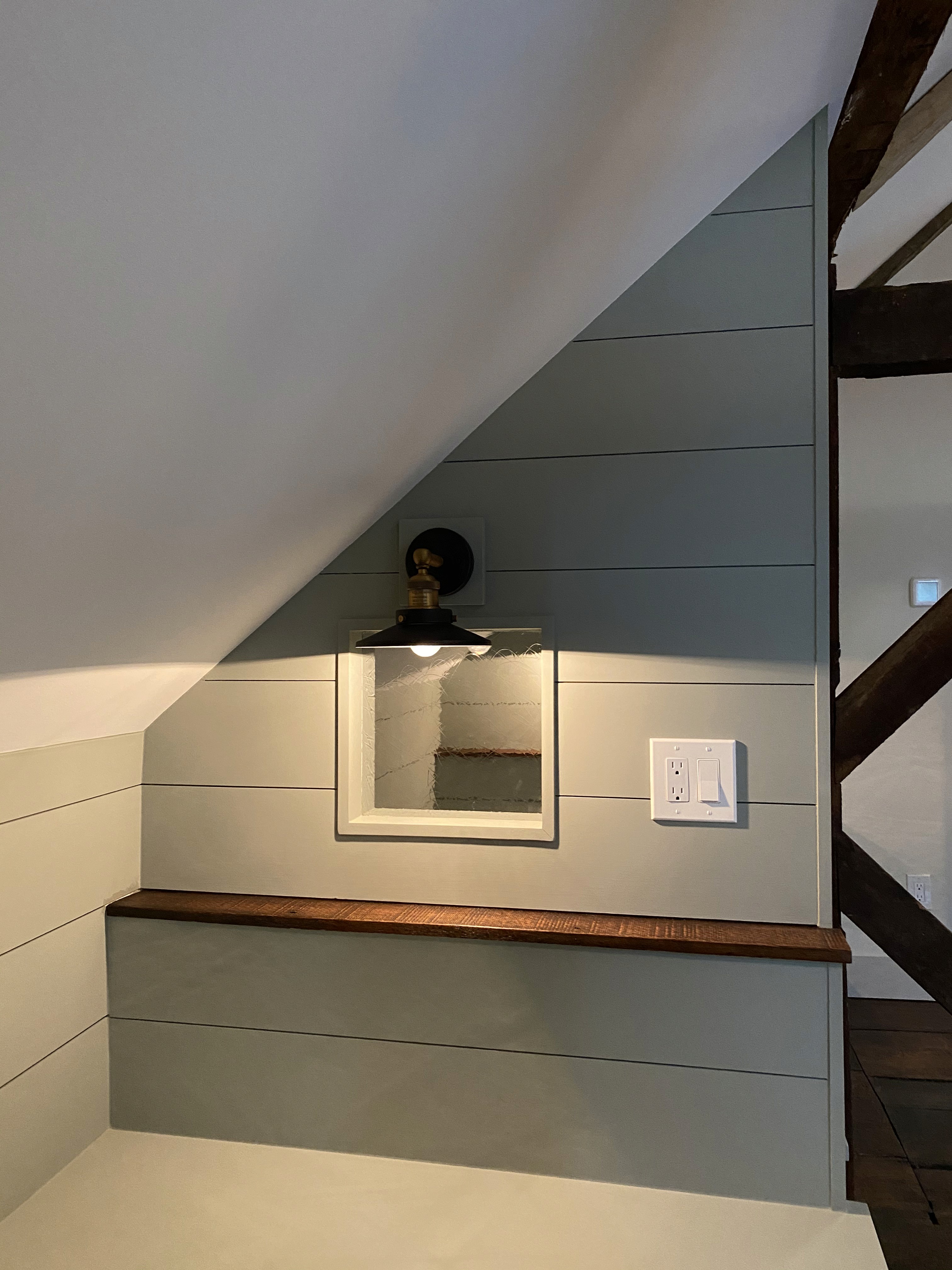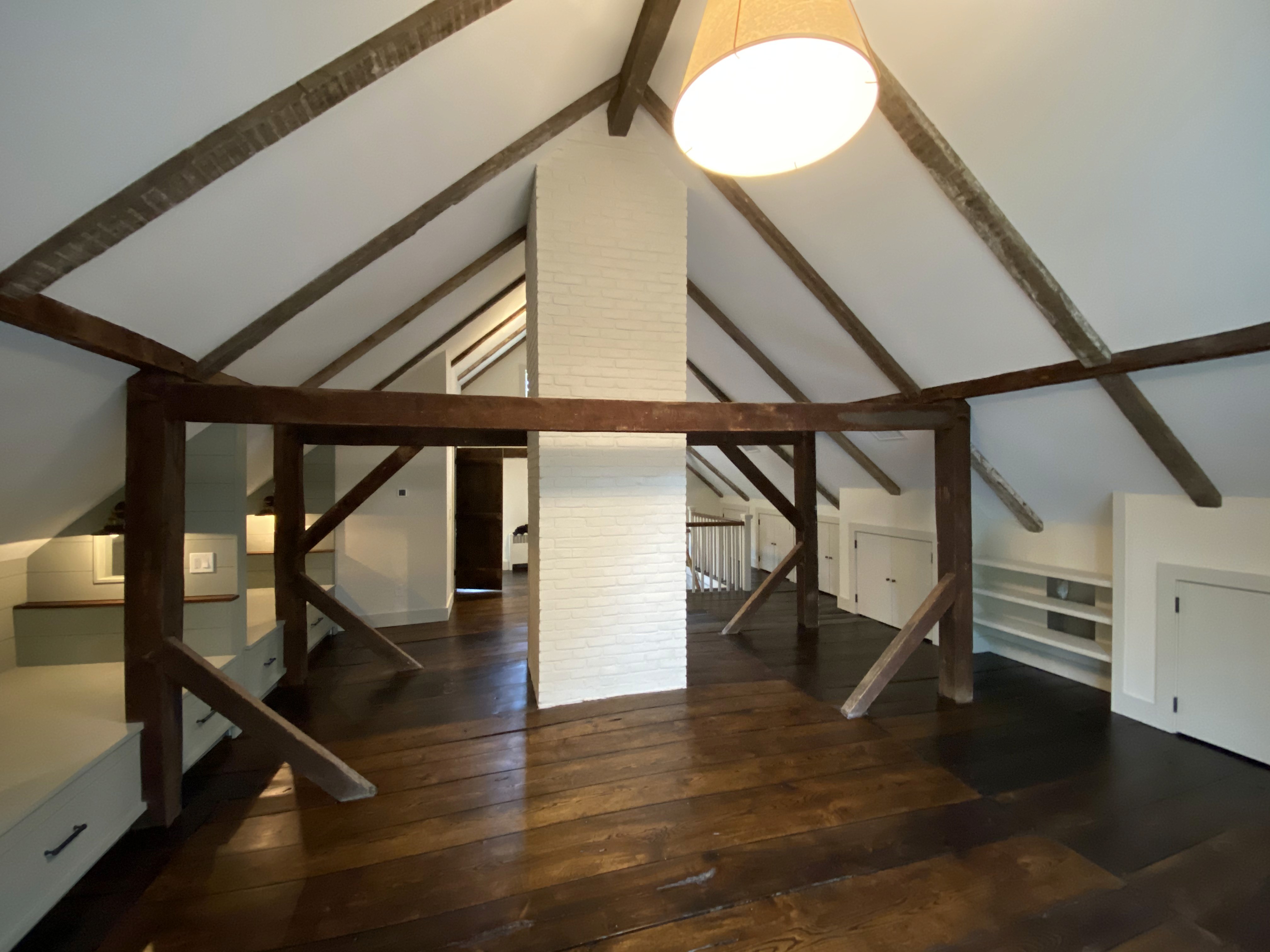 The new space features extensive custom carpentry—each piece thoughtfully designed to maximize the sloped-roof geometry of the attic. Built-in beds with deep storage drawers, custom closets, shiplap wall paneling, and handcrafted shelving create a charming, efficient layout that feels both tailored and timeless. Rustic exposed beams were preserved and integrated, maintaining the warm, historic spirit of the property.