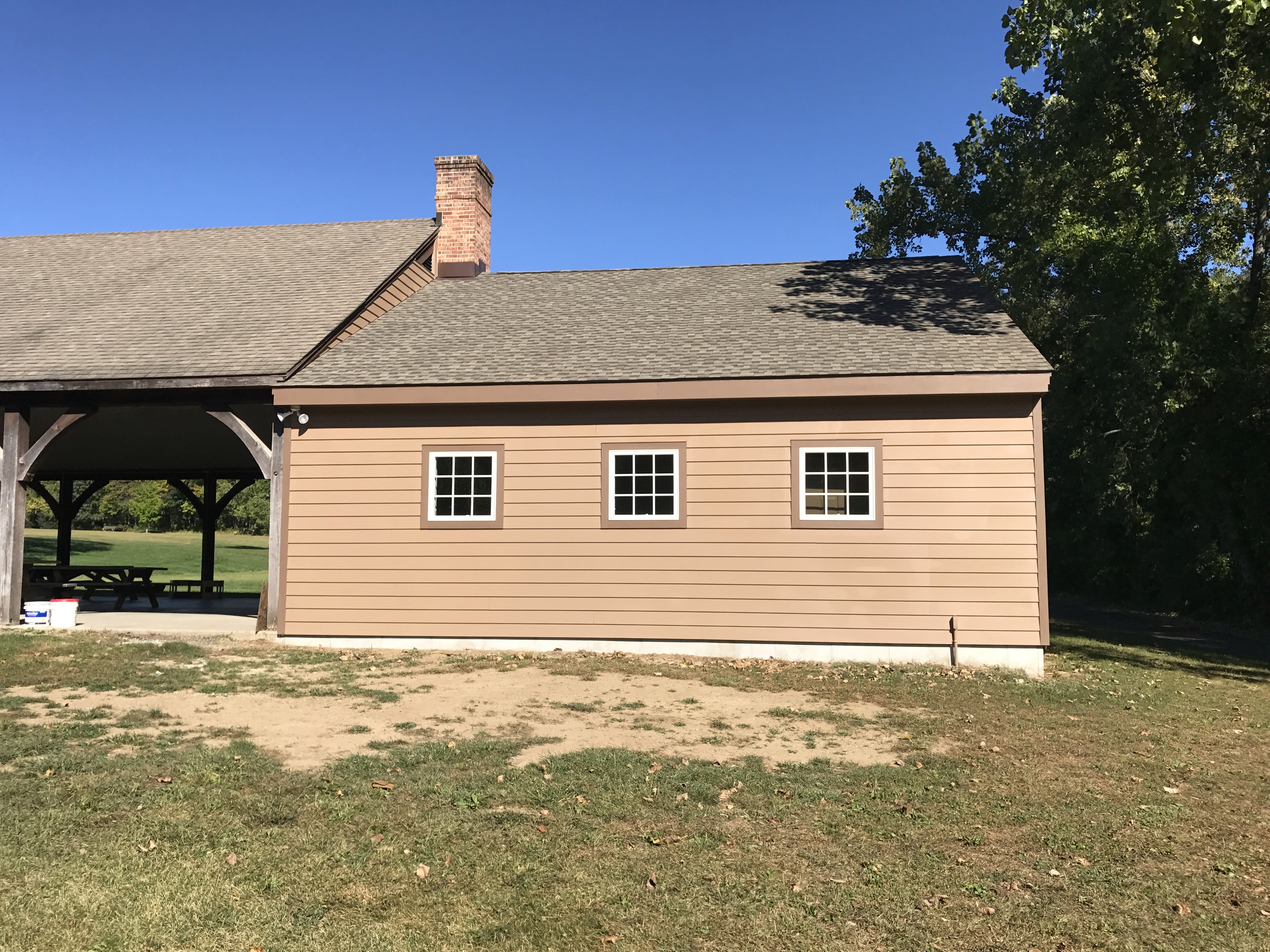 To balance longevity with aesthetics, the exterior was finished with 1” x 8” TruExterior® Poly-Ash siding—chosen for its durability, resistance to moisture, and clean architectural lines. The roof was completed with asphalt shingles to match the existing structure and provide long-term weather protection, ensuring visual continuity across the entire pavilion.