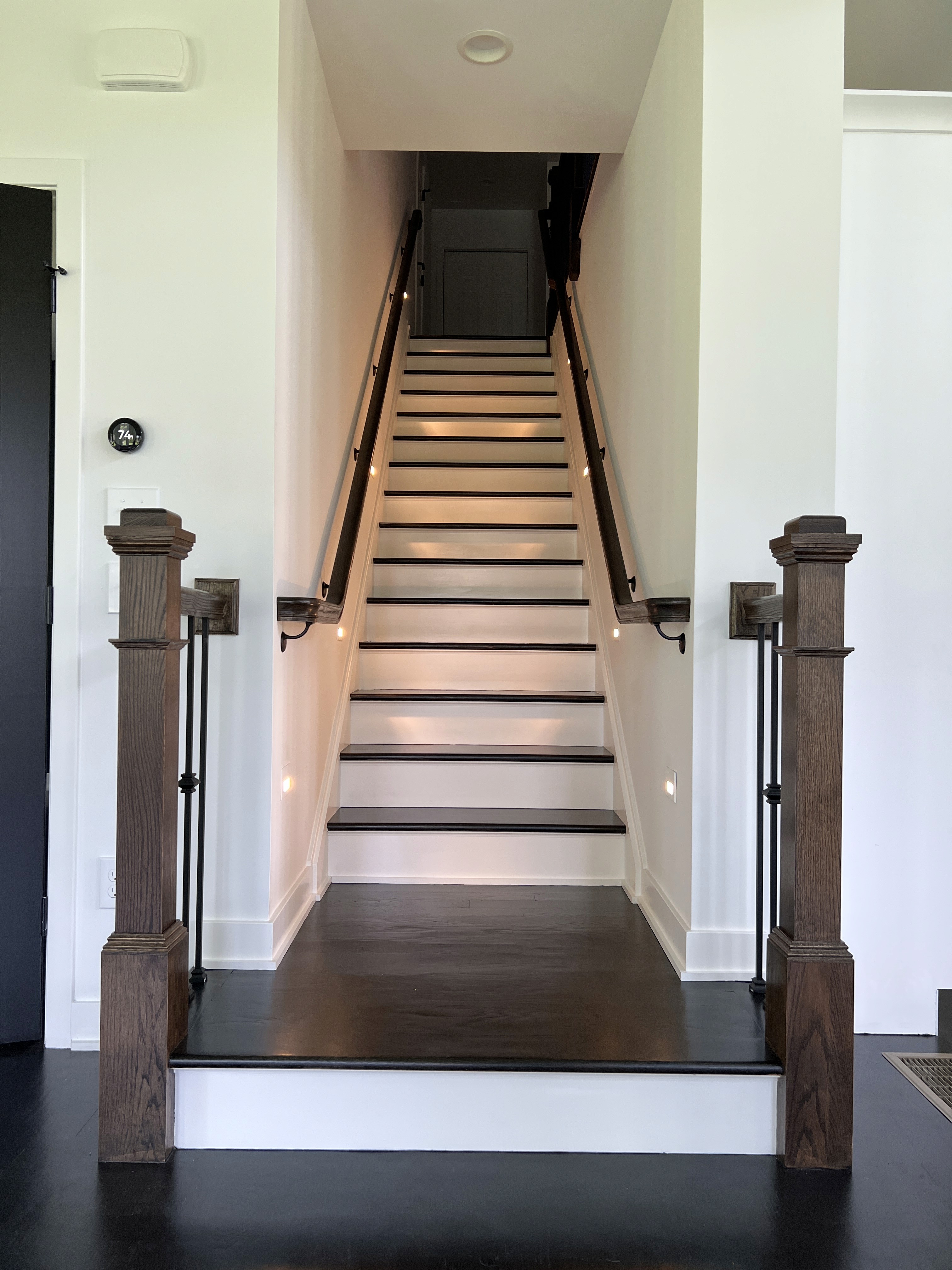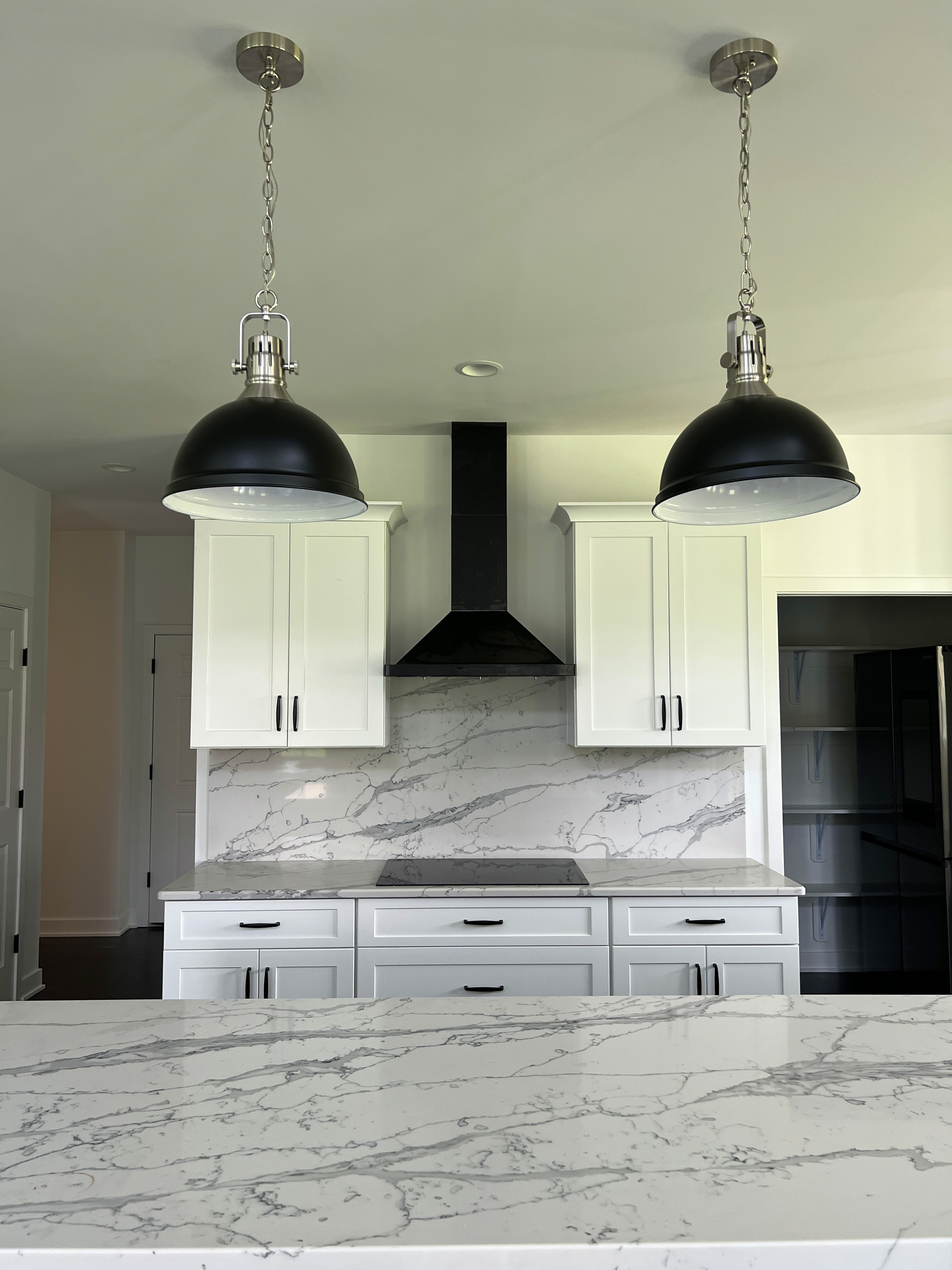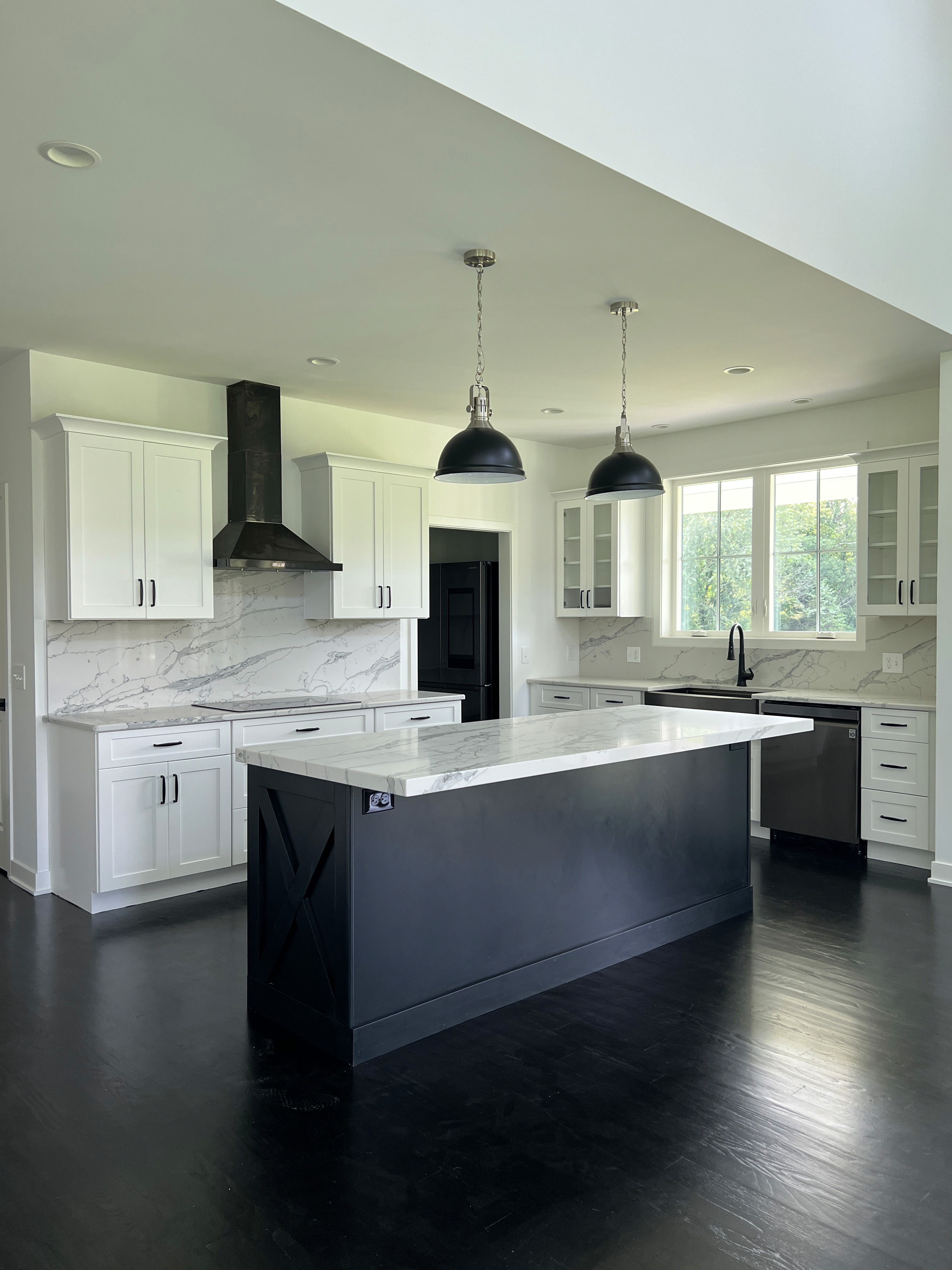 Inside, the home opens to a refined yet comfortable interior defined by dark hardwood flooring, clean architectural lines, and abundant natural light. Marble countertops and backsplashes anchor the kitchen and baths, adding a sense of luxury while maintaining a timeless feel. Throughout the home, modern fixtures and hardware were selected to complement the overall aesthetic without overpowering the space.