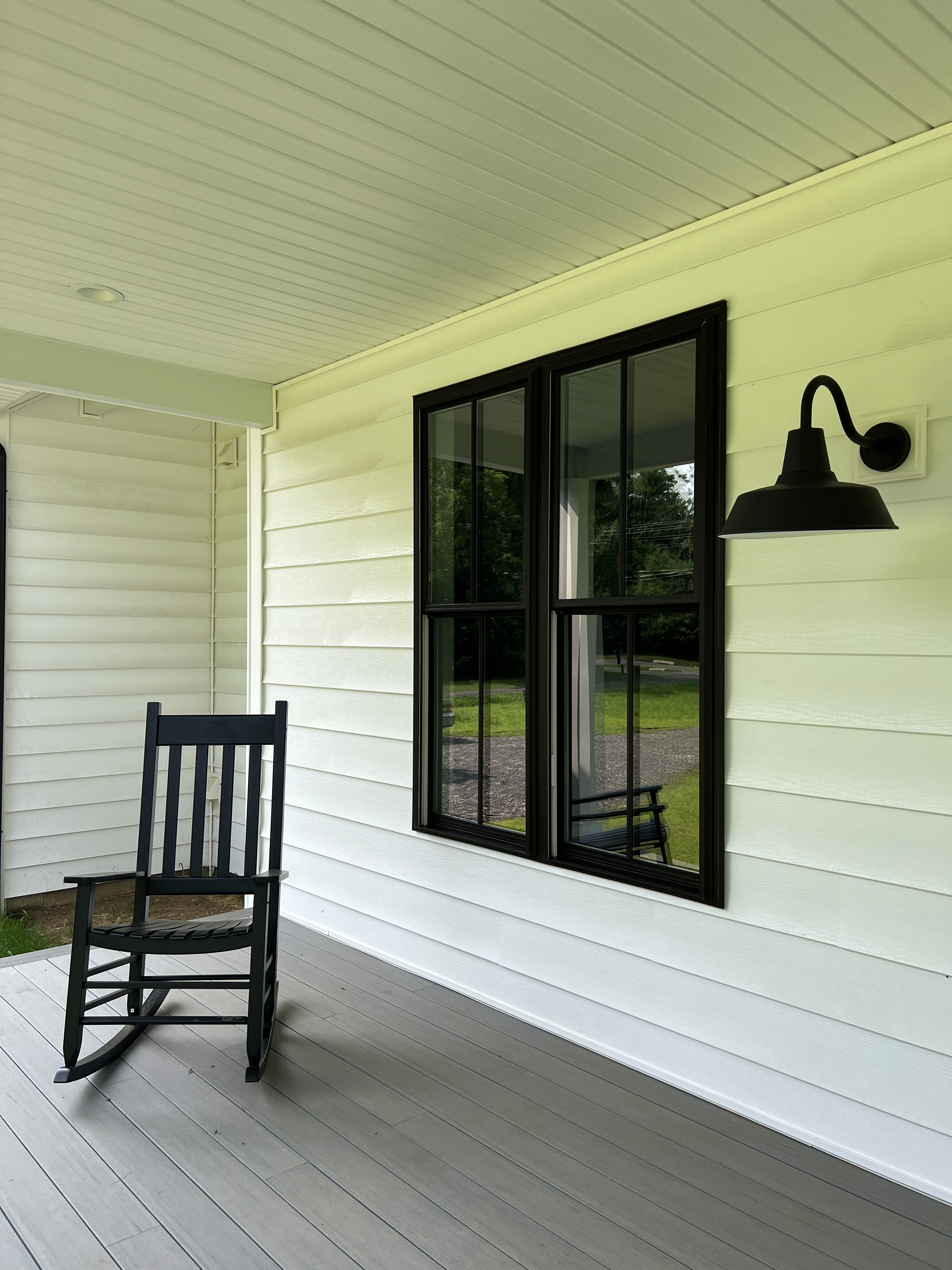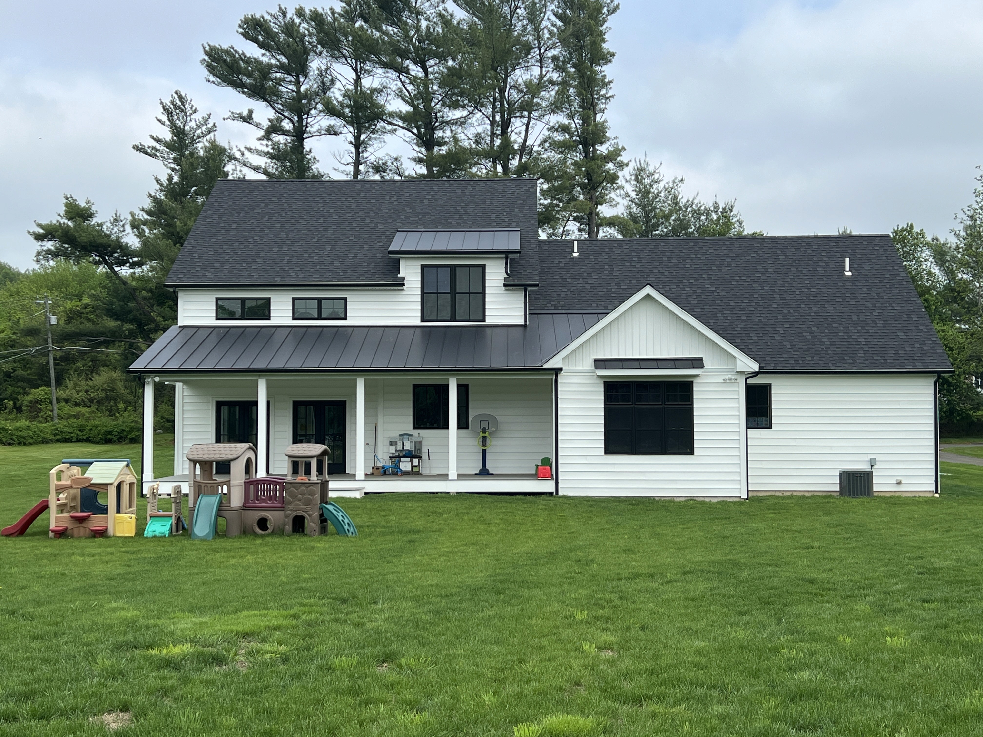 The exterior of the home was designed to make a statement while remaining grounded in traditional colonial form. Black-framed windows provide crisp contrast against the siding, while standing-seam metal roofing introduces a modern edge and long-lasting performance. The facade combines wide 8" vinyl clapboard with board-and-batten accents, adding texture and visual depth without overwhelming the home’s clean lines.