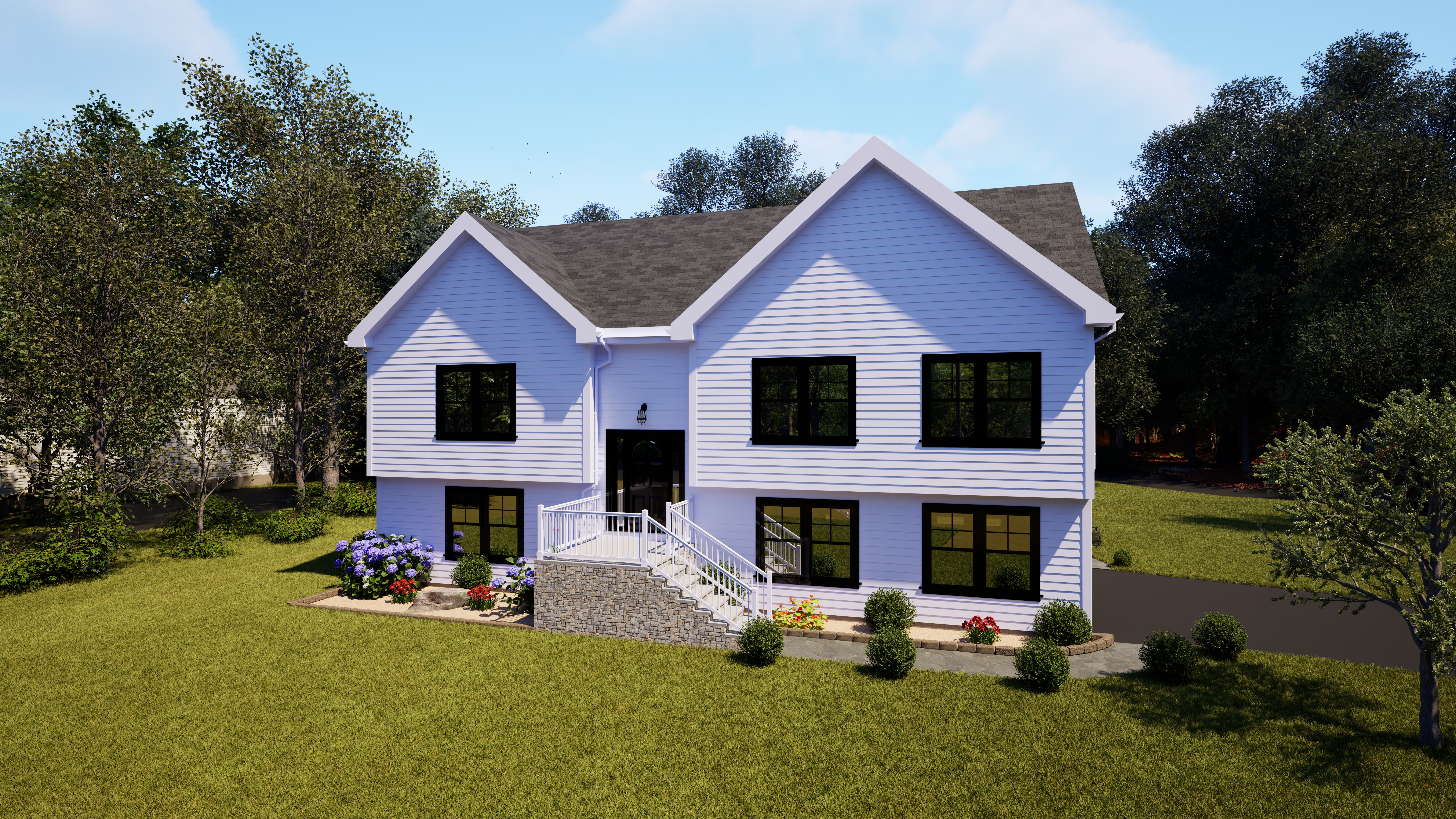 The home features a refreshed raised ranch layout with symmetrical front elevations, modern black windows, and crisp white siding. Clean rooflines and minimal trim create a timeless yet contemporary aesthetic that stands out while remaining approachable.