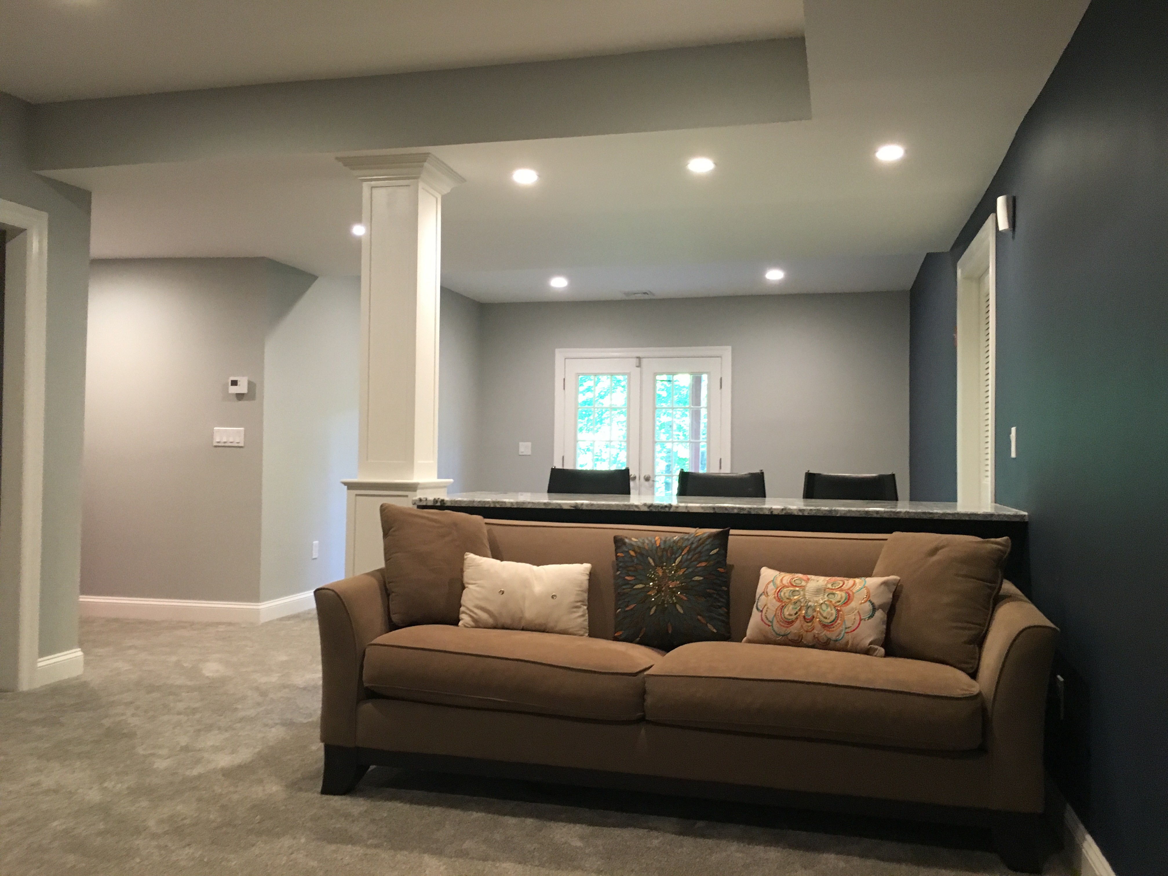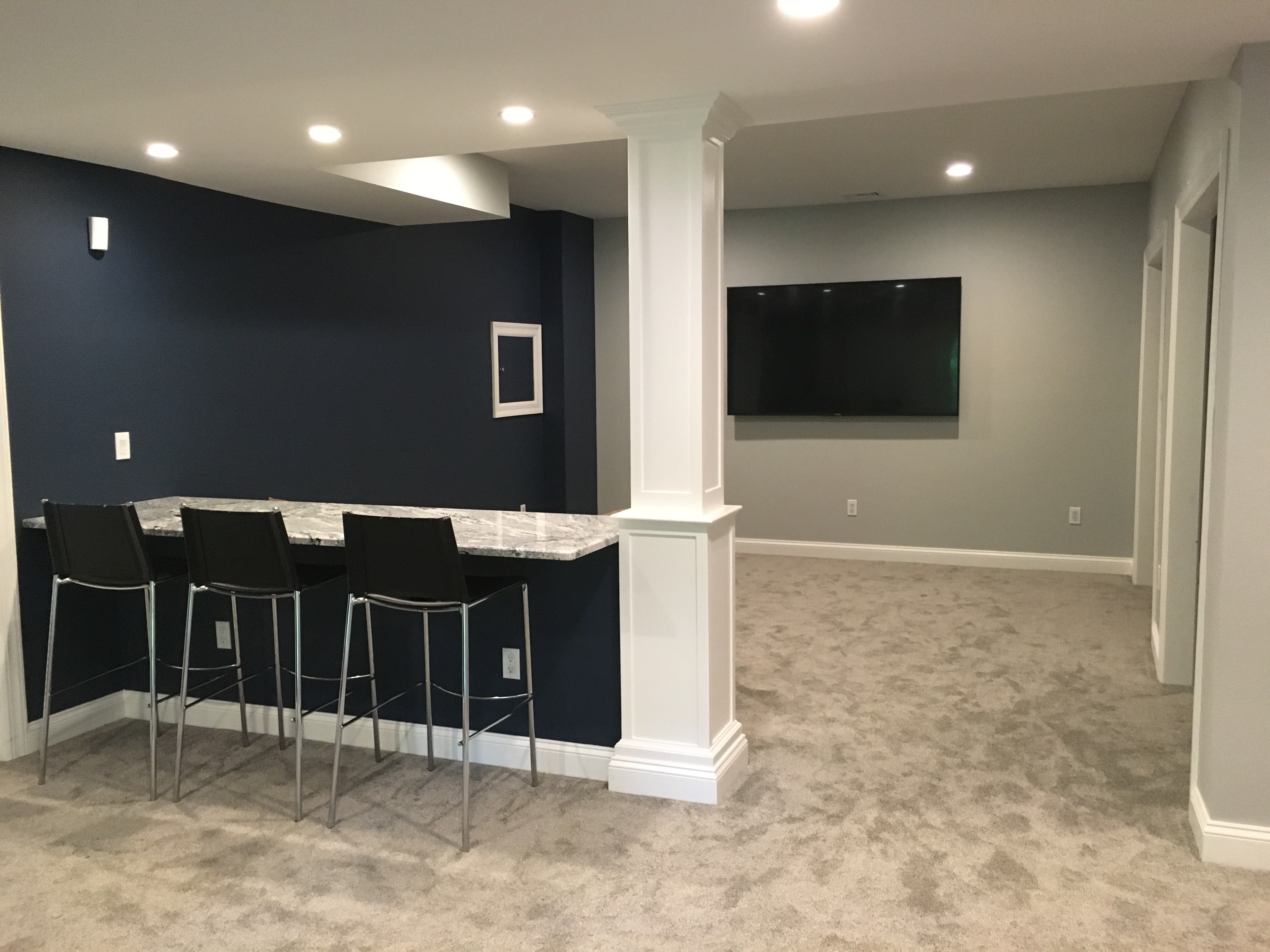 This lower-level renovation transformed an unfinished basement into a fully functional living space complete with a dedicated movie room, entertainment counter, workout area, full bathroom, and a new bedroom.