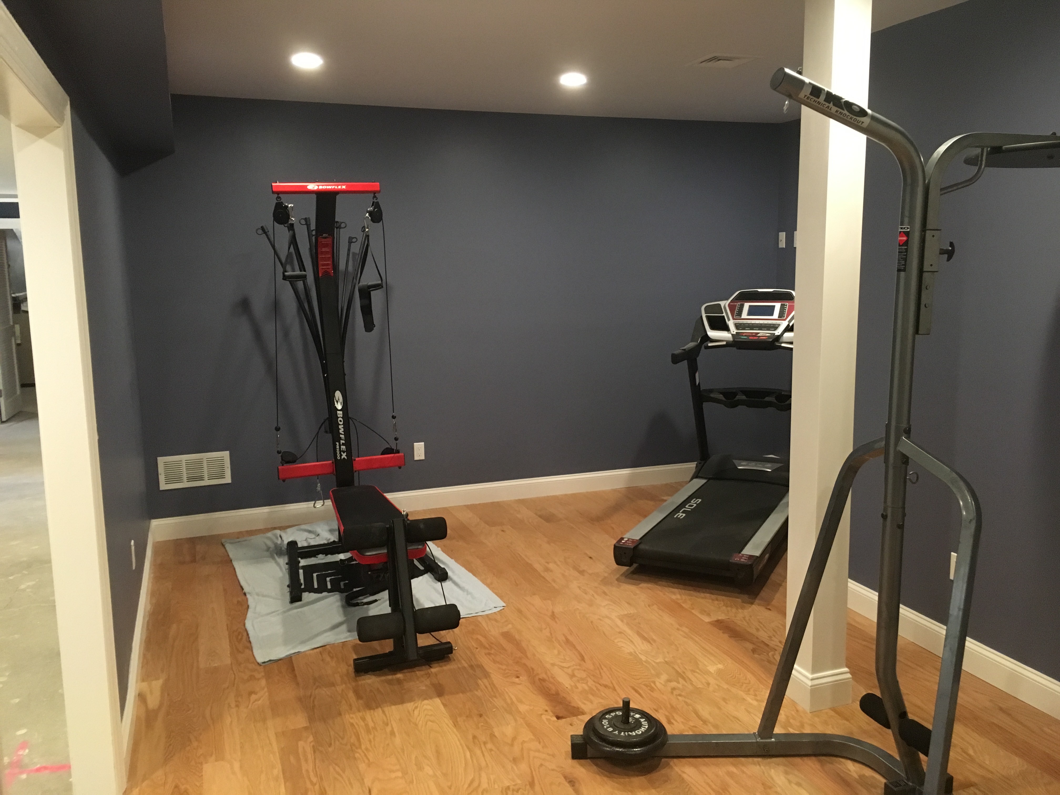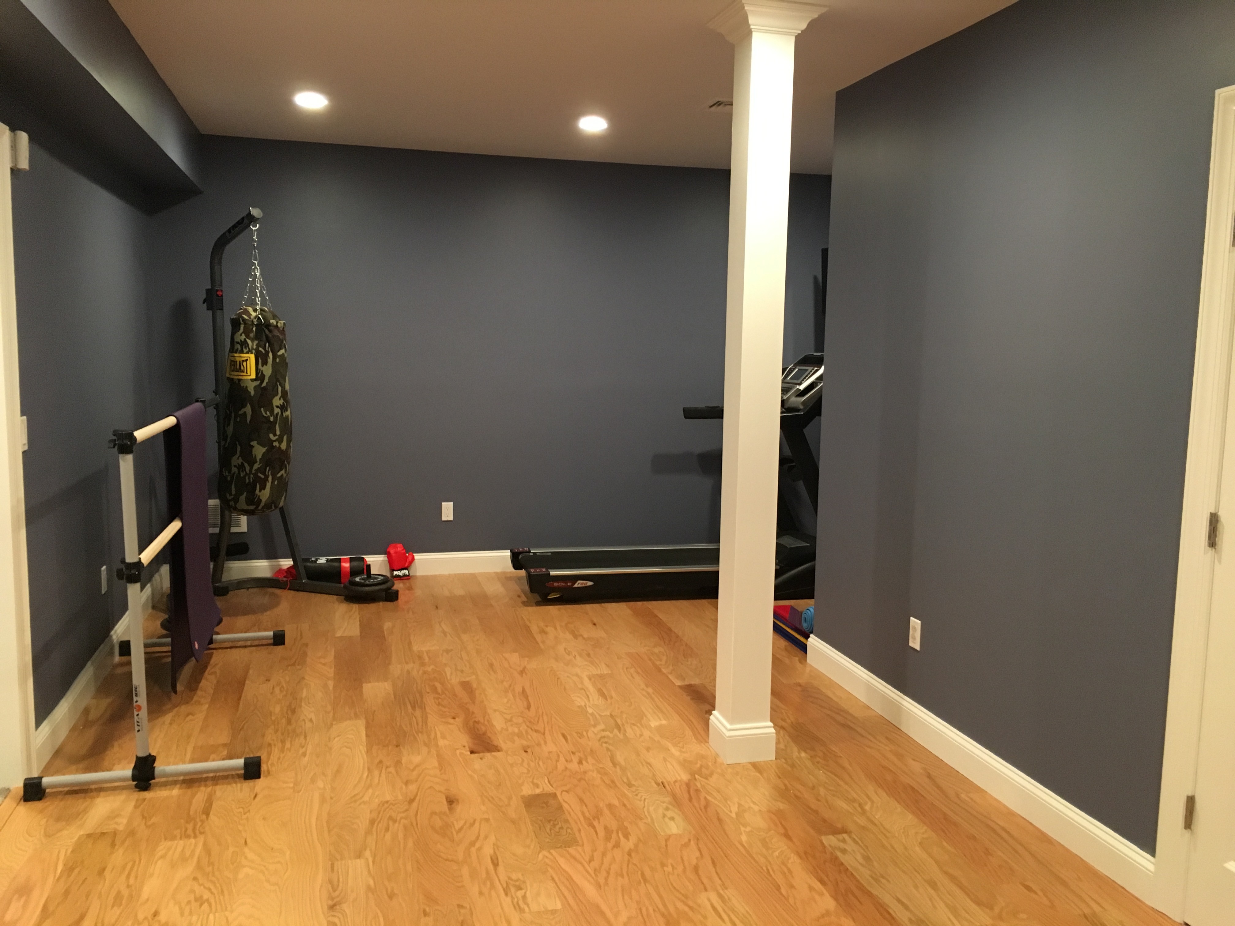 Adjacent to the entertainment area, we created a dedicated workout space with durable hardwood flooring, open wall space for exercise equipment, and ample lighting. The contrasting flooring not only defines the fitness zone but also provides the durability needed for gym use.