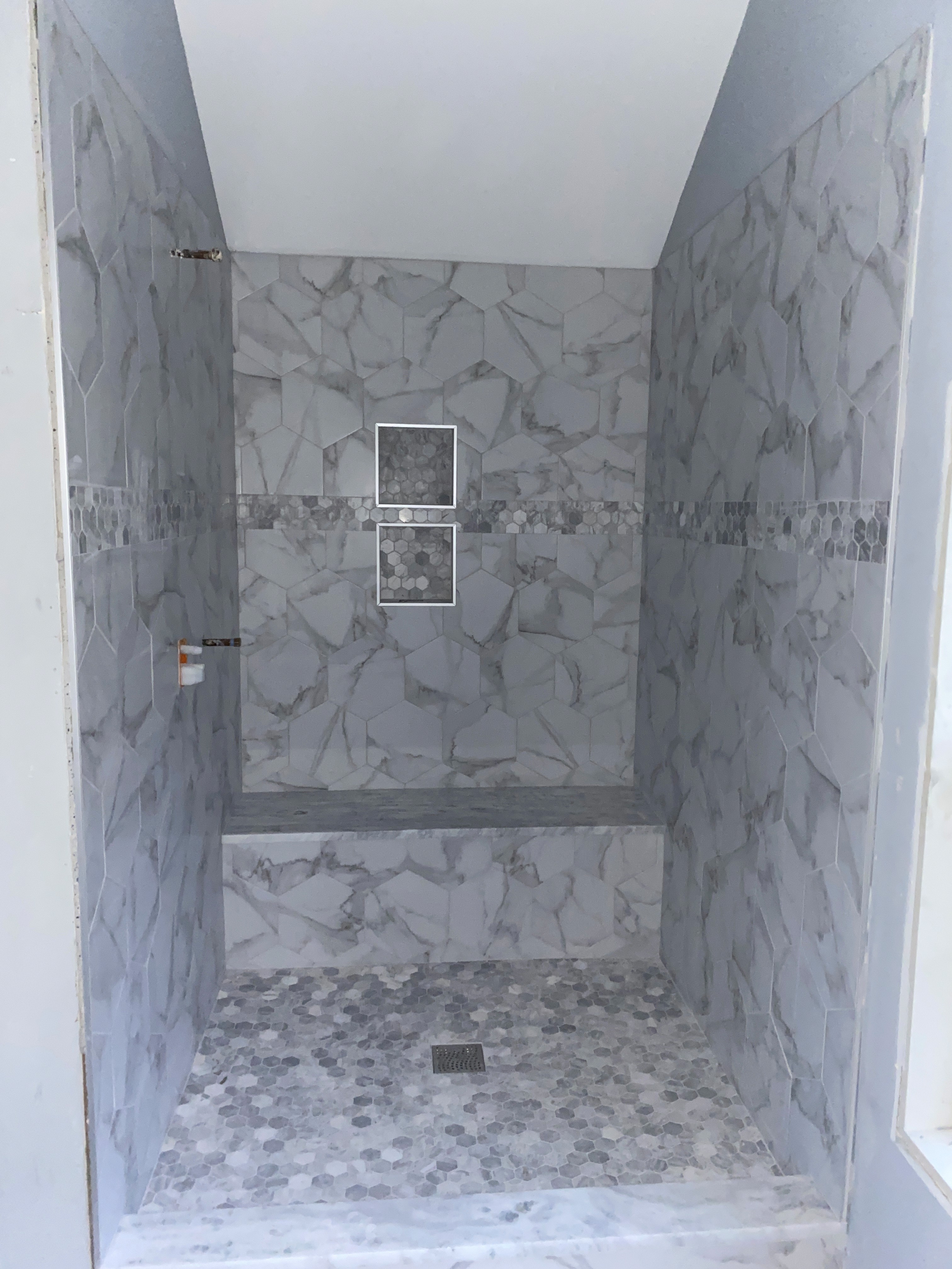 The full bathroom features a custom-tiled shower with integrated niches, a tiled shower bench, and carefully selected finishes that elevate the overall design. Materials were chosen for durability, ease of maintenance, and visual appeal, creating a spa-like environment that complements the rest of the suite.